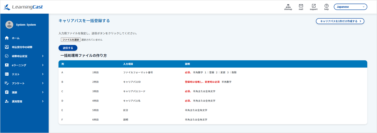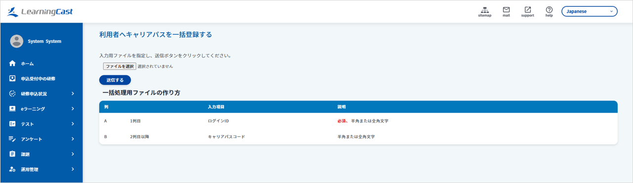 メニュー「運用管理>利用者>キャリアパスを一括割当する」をクリックし、一括処理の入力フォームを表示します。