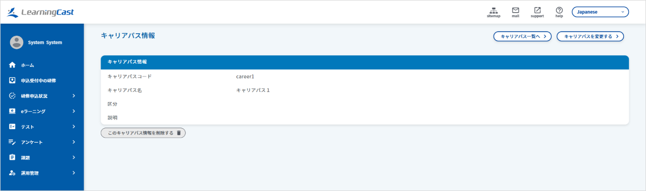 キャリアパスを削除すると利用者、eラーニング、コンテンツに登録されているキャリアパスの情報が削除されます。