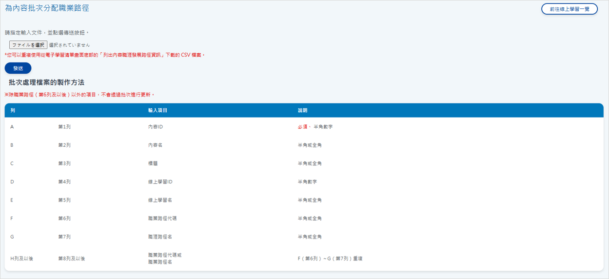 點選「批次分配內容職業路徑」以顯示大量職業路徑分配畫面。