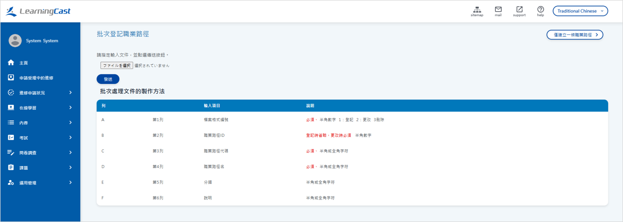 使用 CSV 檔案批次註冊、變更或刪除職業發展路徑的步驟如下: