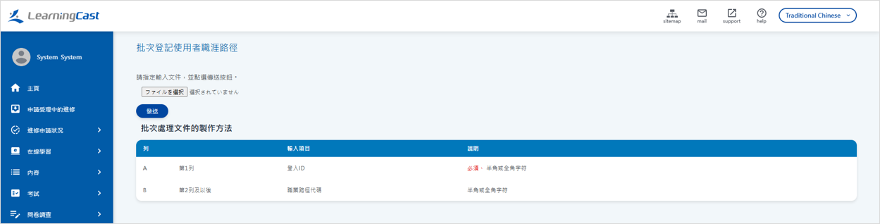 點選選單“營運管理 > 使用者 > 批次分配職涯發展路徑”,顯示批次處理的輸入表單。