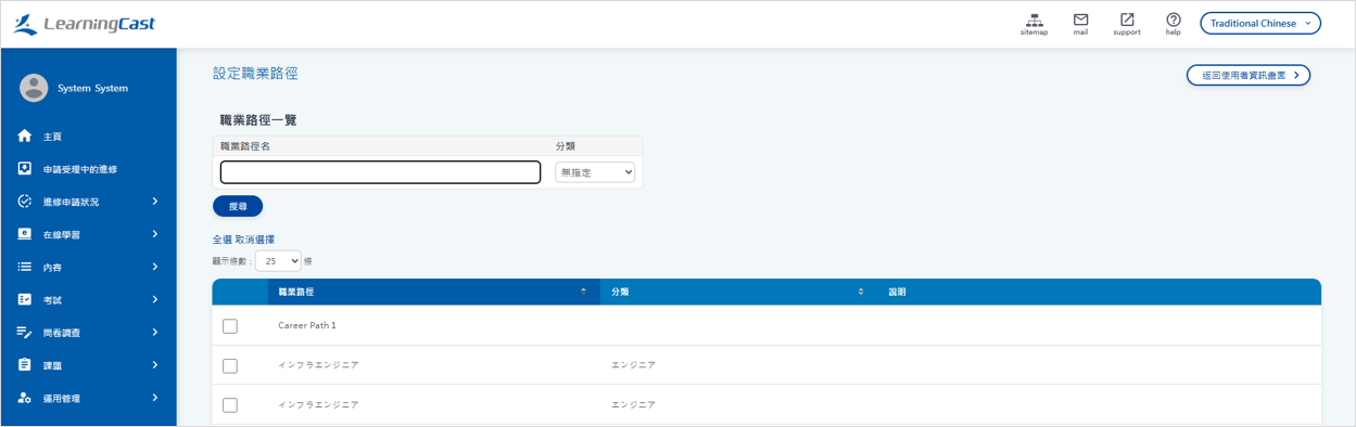 點選選單“營運管理 > 職涯發展路徑 > 查詢”,即可顯示職涯發展路徑清單。